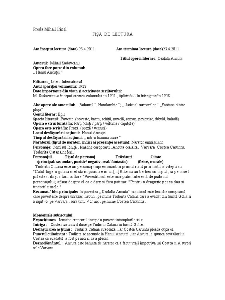 Fisa bibliografica mihail sadoveanu. Mihail sadoveanu s a nascut la 5 noiembrie 1880 la pascani ca fiu al avocatului alexandru sadoveanu si al profirei ursache fata de razesi. Urmeaza cursurile scolii primare in orasul natal gimnaziul la falticeni iar liceul la iasi. Fisa de lectura opera epică titlul operei literare. 5 noiembrie 1880 pașcani d.