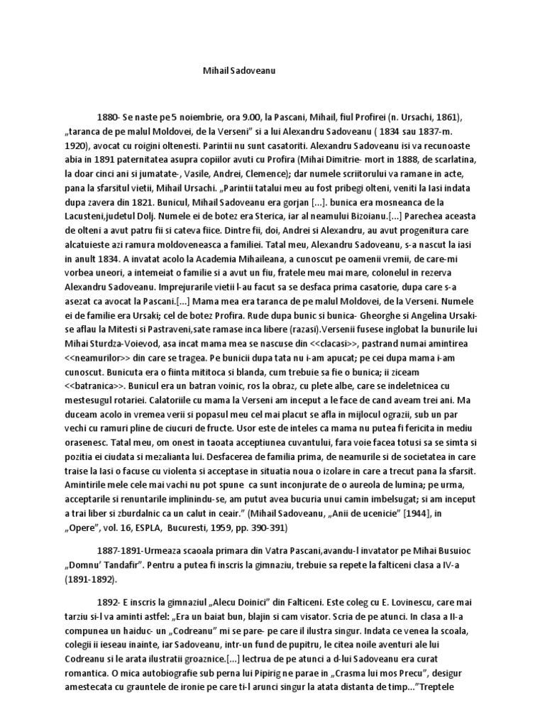 Mihail sadoveanu n. Puteti gasi foarte multe referate accesand categoriile din partea dreapta despre fisa biografica a lmiui mihail sadoveanu. Mihail sadoveanu s a nascut la 5 noiembrie 1880 la pascani ca fiu al avocatului alexandru sadoveanu si al profirei ursachi fiica de razesi din verseni. Mihail sadoveanu a fost scriitor nuvelist povestitor romancier academician și om politic fiind considerat unul dintre cei mai importanți prozatori ai literaturii române din prima jumătate a secolului xx.