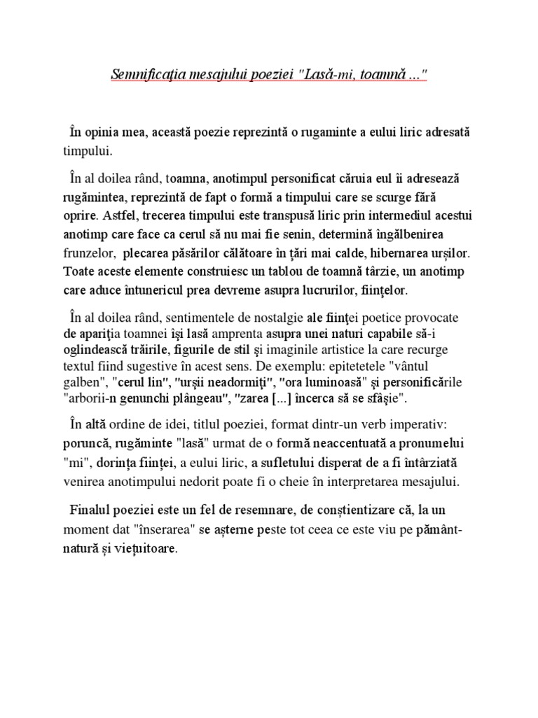 8 martie 2016 09 45. Un exemplu de comentariu care poate fi folosit la clasă. Recomandăm realizarea comentariului poeziei ținând cont de cerințele enumerate în subiectul de examen. Mesajul poeziei are semnificatii potențate de varietatea figurilor de stil si a imaginilor artistice folosite.