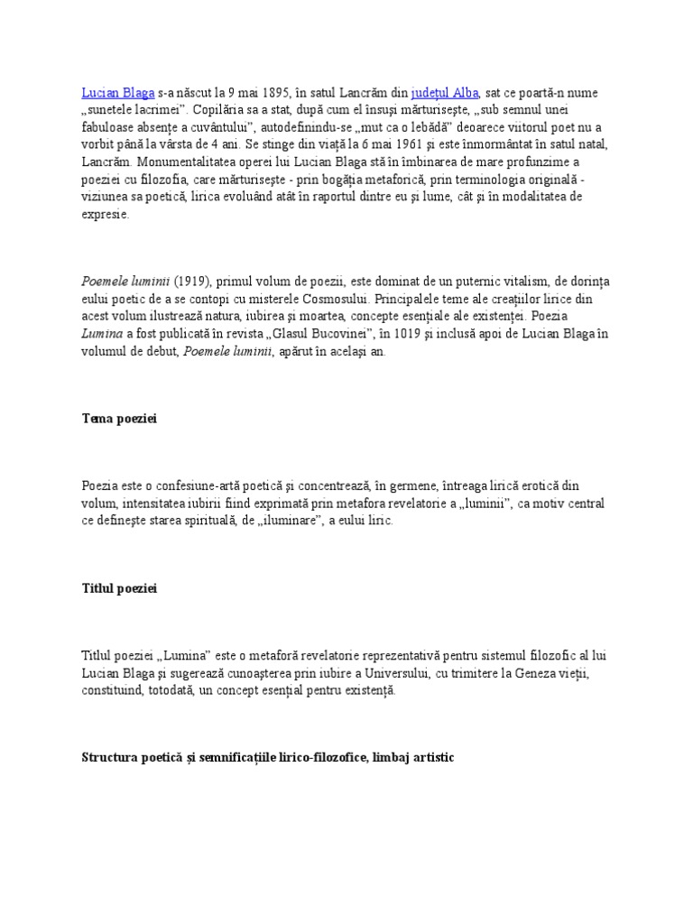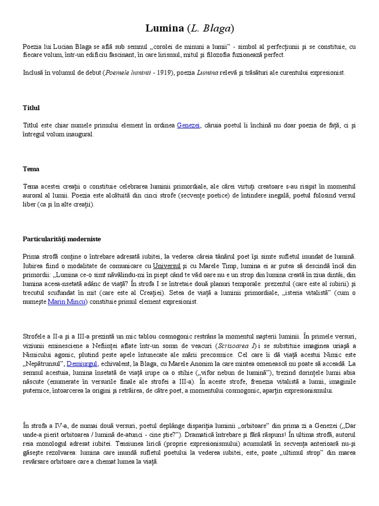 1895 1961 note bibliografice. Poezia lumina scrisa de lucian blaga referate poezia lumina scrisa de lucian blaga. Poezia lumina a fost publicată în revista glasul bucovinei în 1919 şi inclusă apoi de lucian blaga în volumul de debut poemele luminii apărut în acelaşi an. Frumoaso ti s ochii asa de negri incat seara.