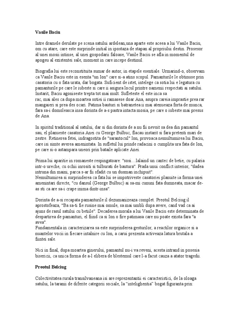 Fundamentala in caracterizarea sa este surprinderea gesturilor a reactilor organice si a nuantelor vocii in fiecare intalnire cu ion a carui prezenta activeaza latura brutala a fiintei sale. Eseu relatia dintre doua personaje ion. Decaderea morala a lui vasile baciu este determinata de despartirea de pamanturi el fiind ca si ion o fire patimasa care nu poate exista fara a avea. Flacau chipes si istet dar sarac desi tanjeste dupa frumoasa florica saraca si ea se insoara cu ana lui vasile baciu o fata uratica si slaba dar cu locuri si case si vite multe.