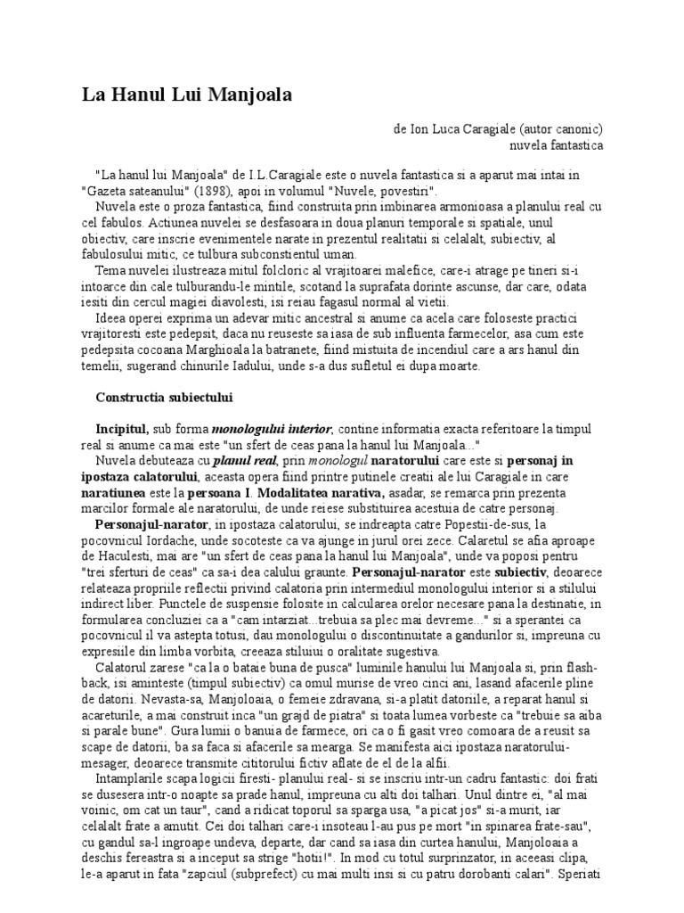 Rezumat la hanul lui manjoala. In nuvele si povestiri i l caragiale depaseste observatia atenta critica si ironica asupa realitatii cotidiene deschizand cateva porti catre teme si spatii incitante receptate ca o experienta de creatie adaptata la curentele literare ale epocii primul aspect ar fi o subtila intruziune a fantasticului in planul real al actiunii sporindu i. La hanul lui manjoala ii. Profesorii noștri au inclus în acest rezumat complet toate informațiile de care ai nevoie pentru a putea răspunde la întrebările din manualul de limba și literatura română dar și pentru a putea redacta propriile eseuri de nota 10. Academia edu is a platform for academics to share research papers.