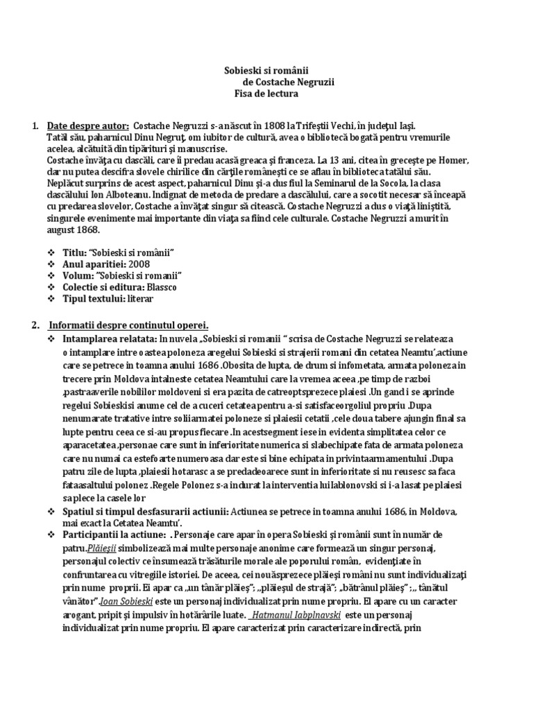 Sobieski si romanii este o nuvela deoarece timpul si locul sunt bine precizate septembrie 1686 pe drumul ce duce catre cetatea neamtu iar actiunea este de lunga durata aproximativ 5 zile contrar actiunii din schita care se desfasoara pe durata a cateva ore. Sobieski si romanii costache negruzzi dupa un trup de lancieri ce deschidea marşa urmau douasprezece tunuri mari trase de boi apoi o ceata de ofiţeri calari în fruntea carora erau trei. Câteva informaţii relevante despre autorul nuvelei anterior menţionate definiţia generală a nuvelei alte exemple de nuvele româneşti şi prezentarea succintă a momentelor subiectului nuvelei.