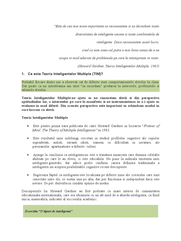 Teoria inteligentelor multiple a lui howard gardner a demonstrat un nivel de aplicabilitate ridicată în domeniul educațional. Teoria inteligențelor multiple a fost propusă de howard gardner profesor de teoria cunoașterii educație și psihologie la universitatea harvard și de neurologie la facultatea de medicină din massachusetts s u a. Teoria inteligentelor multiple a lui gardner a constituit o provocare la adresa opiniilor traditionale in domeniul educatiei si al stiintelor cognitive. The theory of multiple intelligences proposes the differentiation of human intelligence into specific modalities of intelligence rather than defining intelligence as a single general ability.