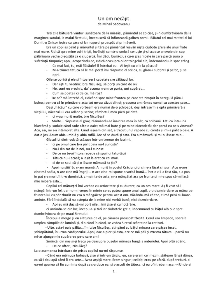 Un om necajit rezumat. Baiatul cel mai mititel al lui dumitru onisor iesise cu sase oi la mugurul proaspat al primaverii. Uita te mai jos si o sa gasesti cele mai relevante rezultate pentru cautarea un om necajit de mihail sadoveanu rezumat. Un om necajit rezumat un om necajit când se îndrepta spre păşune cineva cu o căruţă i a mai lovit o oaie care i o lăsase mama lui care se prăpădise şi ea cu puţin timp în urmă era trist că mama lui a murit în postul crăciunului şi pe el nu mai avea cine să l îngrijască să l mângie să i spună o vorbă bună. Sa nu fie luat de pe net 1 vezi răspunsul mariavisan mariavisan era odata un copilas necajit amarat de fel deoarece era incaltat cu ciubotele fratelui sau mai mare avea ochii tristi si parea galbejit si maruntel.
